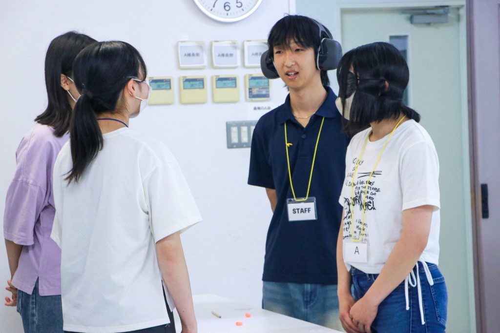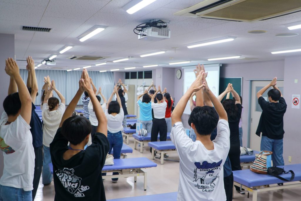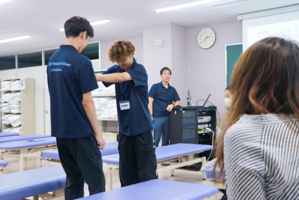 体験授業では、理学療法学専攻「『バランスって何だろう?』—理学療法でバランスを考えてみよう」 作業療法学専攻「見ザル、聞かザル、話さザル 〜障害実体験:百聞と一見は体験に如かず〜」というテーマで各専攻の体験授業を体験してもらいました。