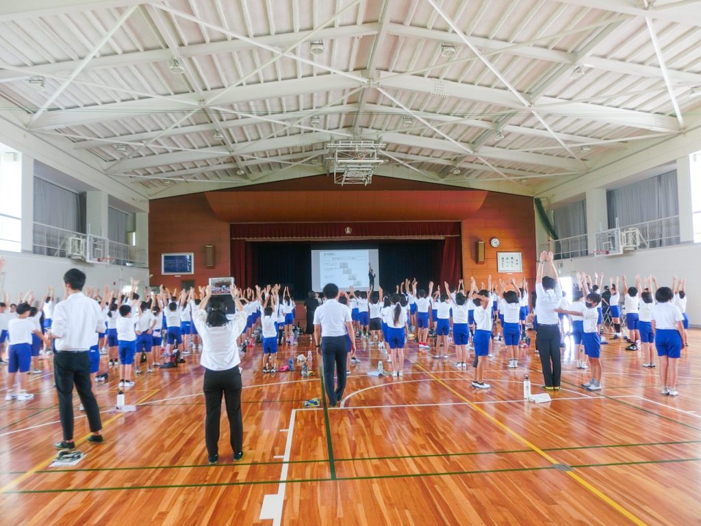 講義の後半では、実際に姿勢を改善するためのストレッチや体操を実施しました。本学の学生もアシスタントとして参加し、児童の皆さんと一緒に行うことで、楽しみながら積極的に身体を動かし、体操に取り組んでいる様子でした。