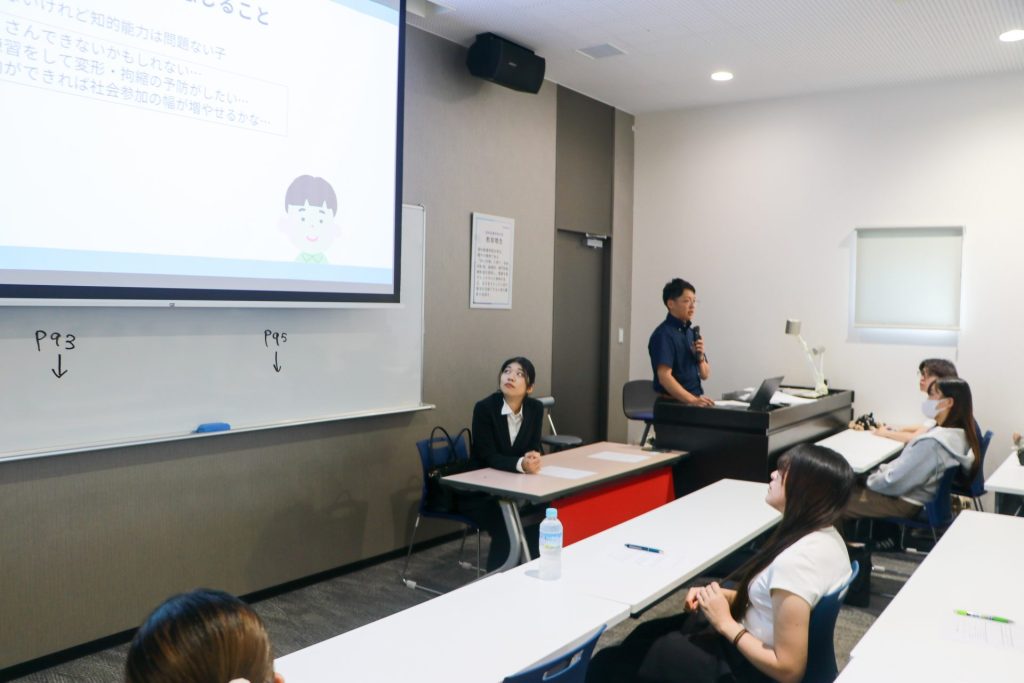 理学療法士の城庵先生と作業療法士の中村先生から、将来のキャリア形成や臨床実習に向けた講話をして頂いた後、グループワークを行い学生同士で話し合いを実施しました。