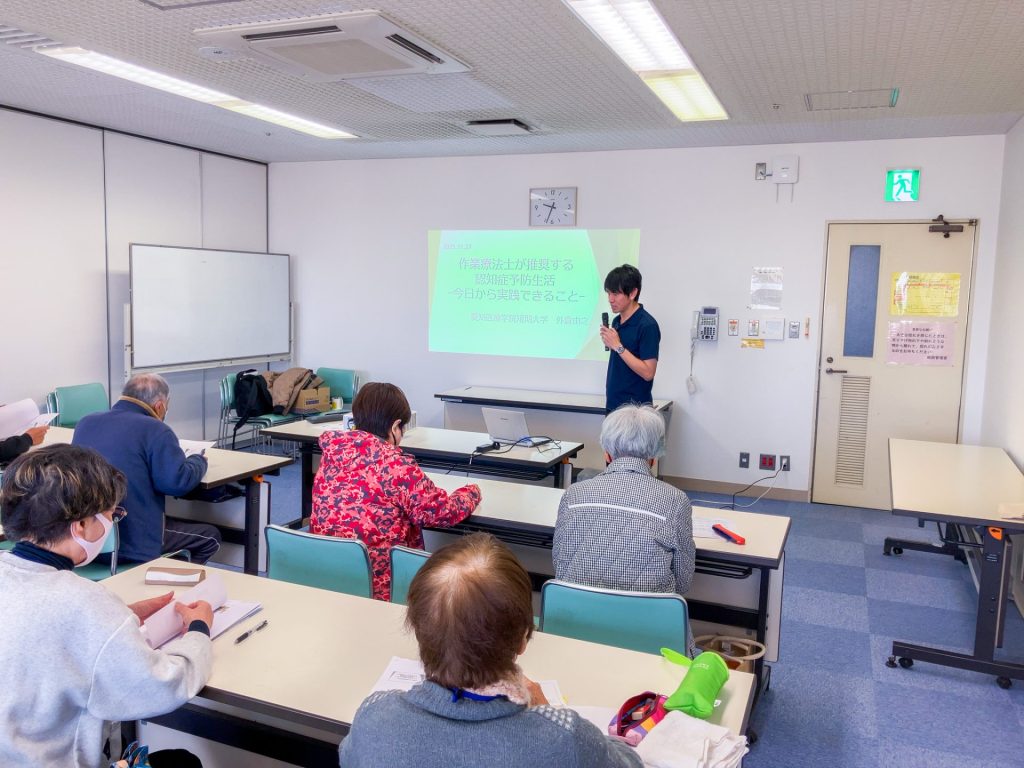 今回は作業療法学専攻 外倉由之先生による「高齢による衰弱予防(認知症含む)」というテーマの講義でした。認知機能の予防には「運動」がとても効果的であることを、世界保健機関(WHO) が推奨しているガイドラインを踏まえて説明しました。