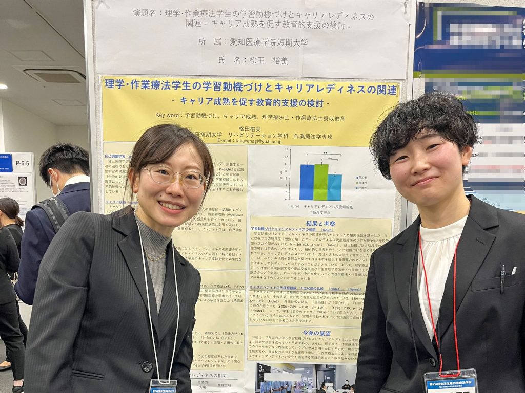 2026.01.14 | 教育・研究 「第24回東海北陸作業療法学会」でポスター発表 2026年1月10日・11日に開催された「第24回東海北陸作業療法学会」で、本学リハビリテーション学科作業療法学専攻の松田裕美助教が「理学・作業療法学生の学習動機付けとキャリアレディネスの関連―キャリア成熟への教育的支援の検討―」というテーマでポスター発表を行いました。学会には、短期大学の卒業生も参加していました。 ニュース一覧に戻る